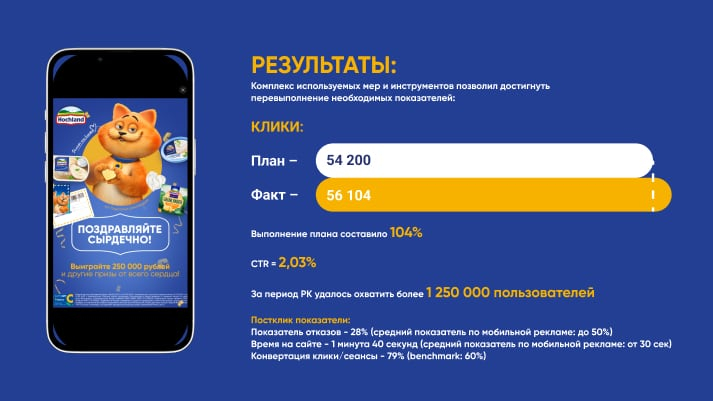 За период РК удалось охватить более 1 250 000 пользователей и получить значение CTR 2,03%. Узнайте подробнее про результаты.