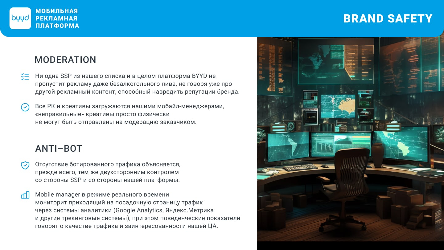 Кроме того, программатик платформа BYYD участвует в аукционе только с проверенными устройствами. А данные о безопасности размещения и чистоте трафика могут подтвердить сервисы: Weborama, Adriver, Gemius, MOAT, Sizmek, DCM, IAS, DoubleVerify.