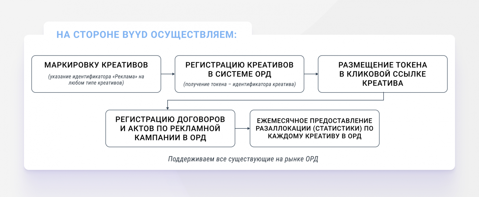 Это значит, что маркировка рекламы, регистрация креативов, получение токенов, подача отчётности и разаллокация по токенам для партнёров BYYD будет и дальше будет в качестве бонуса к мобильному продвижению.