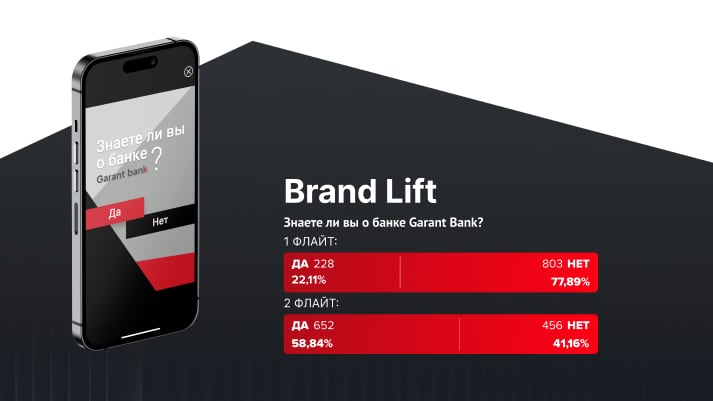 Так, в кейсе Гарант Банк мы использовали Brand Lift исследование. Оно показало, что после проведения мобильной кампании, узнаваемость бренда выросла на 48%.