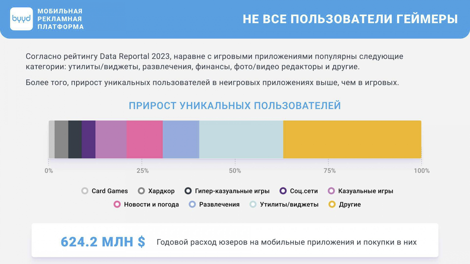Отдельно проговорим: мы можем размещать рекламу не только в игровых приложениях, но и в виджетах, утилитах или любых других категориях.