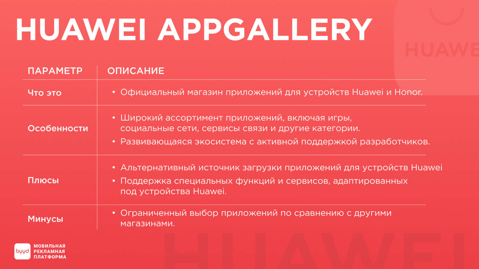 В данном материале мы проанализируем все три основных магазина приложений: Huawei App Gallery, App Store и Google Play. Рассмотрим их преимущества и недостатки, а также расскажем о возможностях размещения рекламы в приложениях магазина Huawei AppGallery с использованием платформы BYYD.