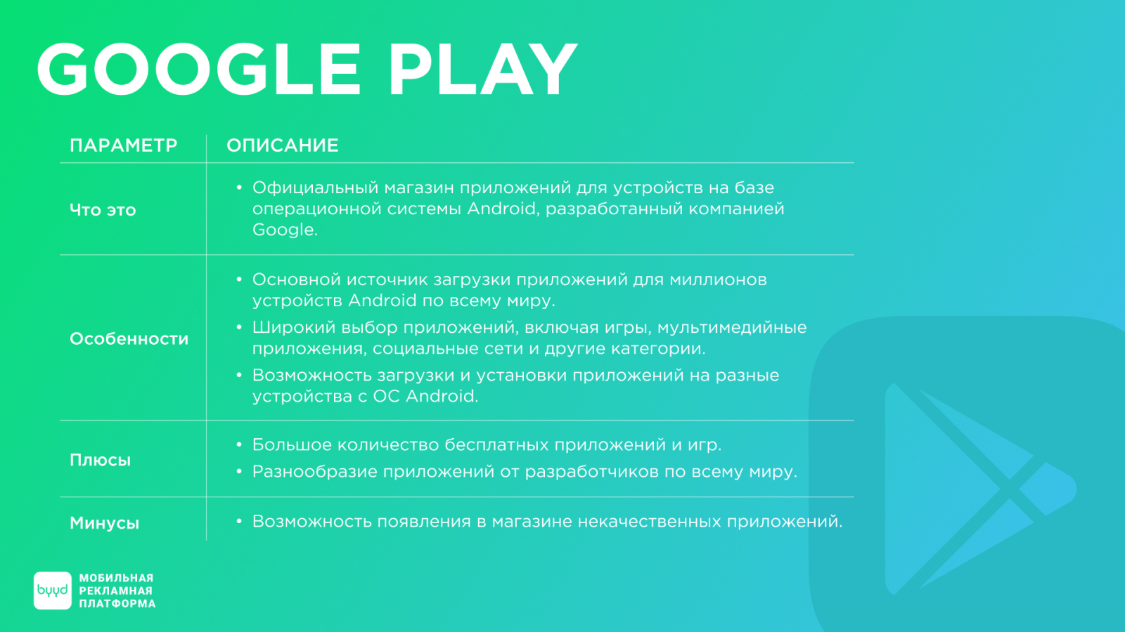 Google Play известен своим удобным интерфейсом, разнообразными функциями поиска и рекомендаций, а также регулярными обновлениями. Однако высокая конкуренция в магазине может затруднить продвижение приложения среди остальных. Это особенно актуально для брендов, которые рекламируются в одной и той же категории.