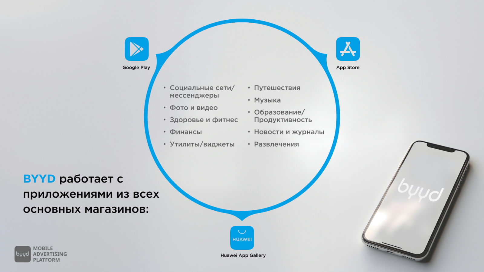 Кстати, платформа BYYD позволяет показывать рекламу в приложениях любых магазинов приложений, включая Huawei AppGallery, App Store и Google Play. Мы можем выбирать определенные типы приложений, такие как утилиты, конвертеры валют, дейтинговые платформы, игры и многое другое.