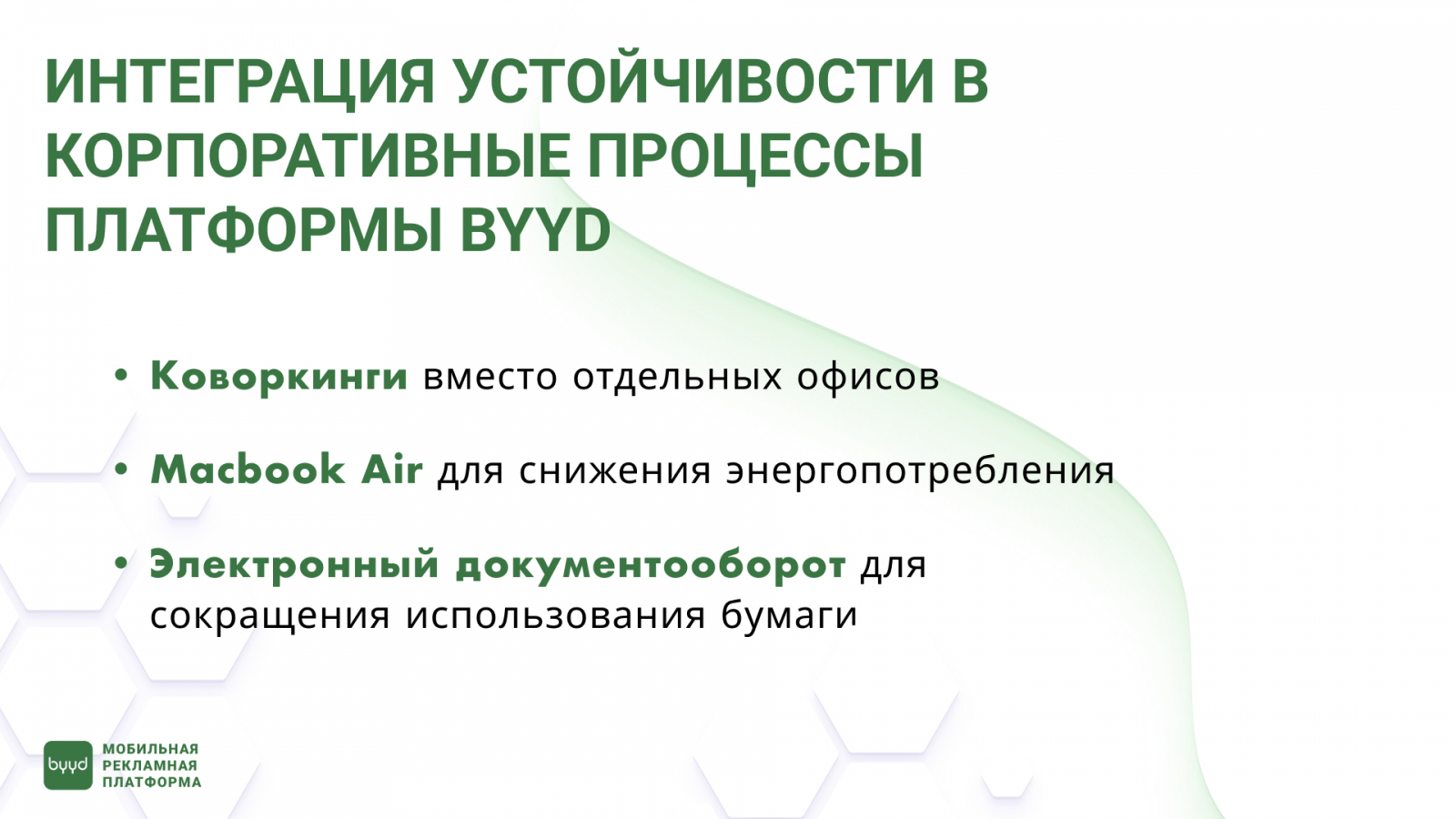 Мобильная рекламная платформа BYYD осознает важность устойчивого производства и влияния на экологию. Поэтому наша команда нацелена на соответствие высоким стандартам экологической ответственности.