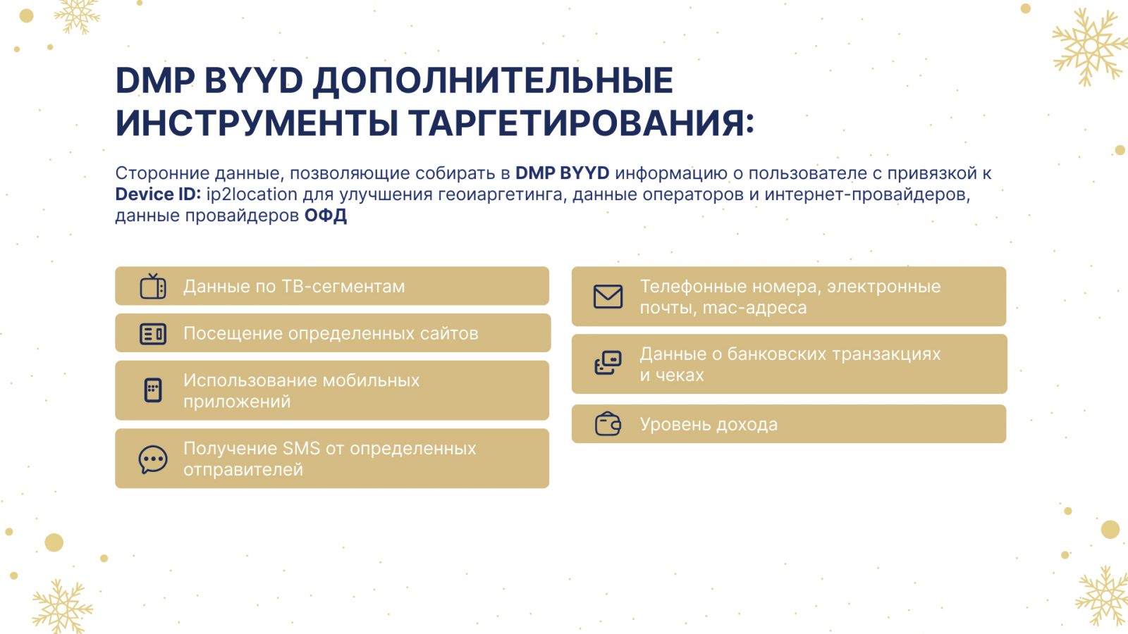 Мы предоставляем все инструменты для таких стратегий — от ретаргетинга до таргетинга с помощью Big Data.