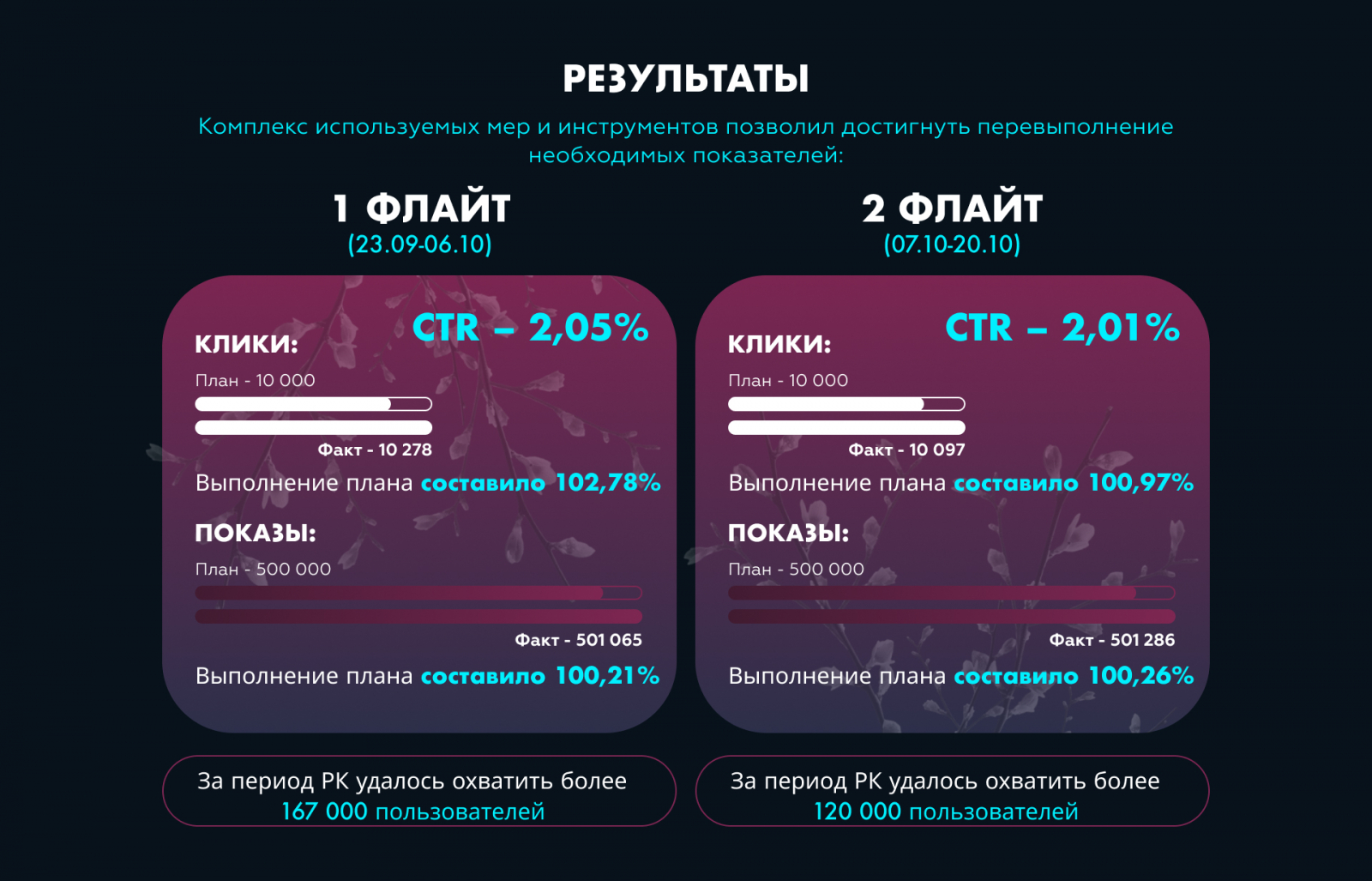 После запуска кампании проводилась регулярная оптимизация на основе данных платформы BYYD и Яндекс Метрики. Кампания была разделена на два флайта, в рамках которых удалось перевыполнить планы по кликам и показам.