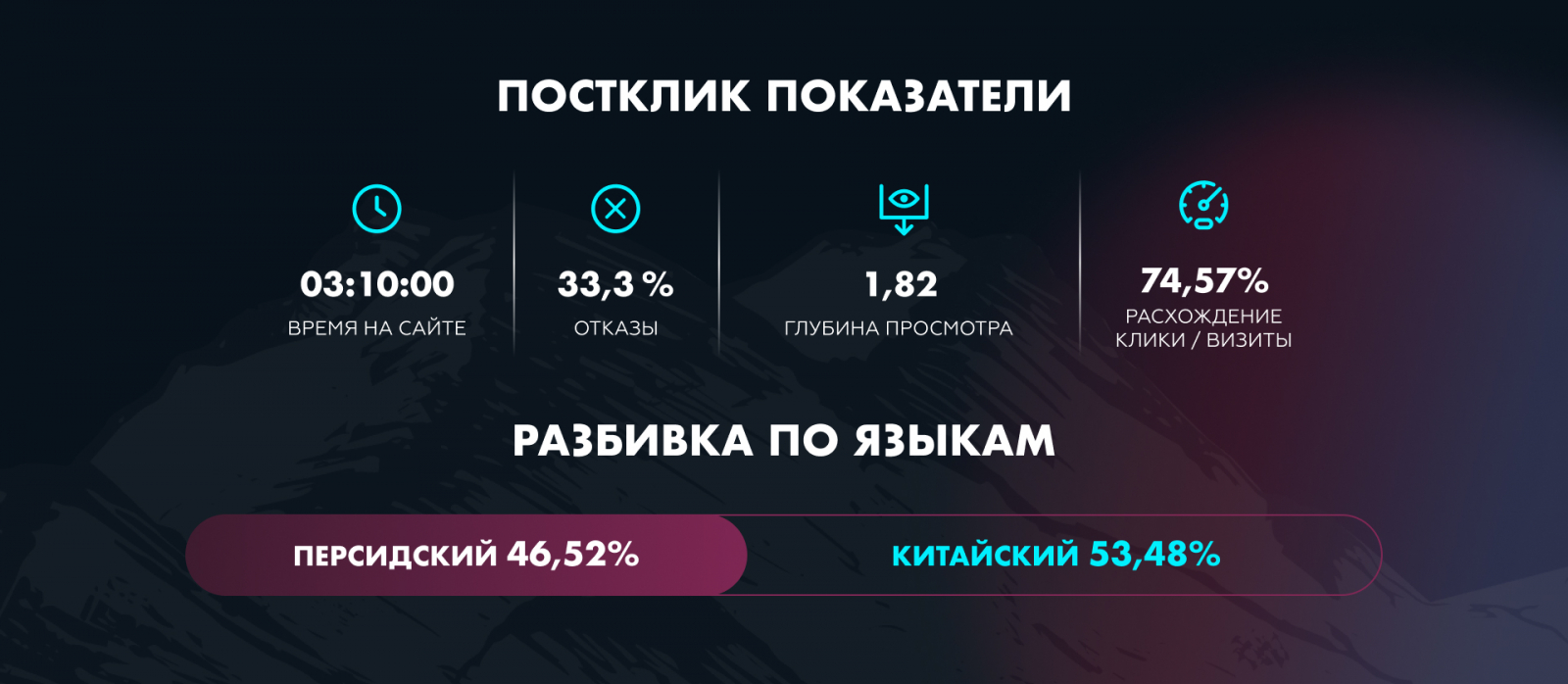 Кроме того, постклик-показатели подтвердили высокий интерес к предложению: среднее время на сайте составило 3:10, что говорит о вовлеченности аудитории.