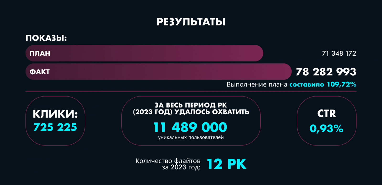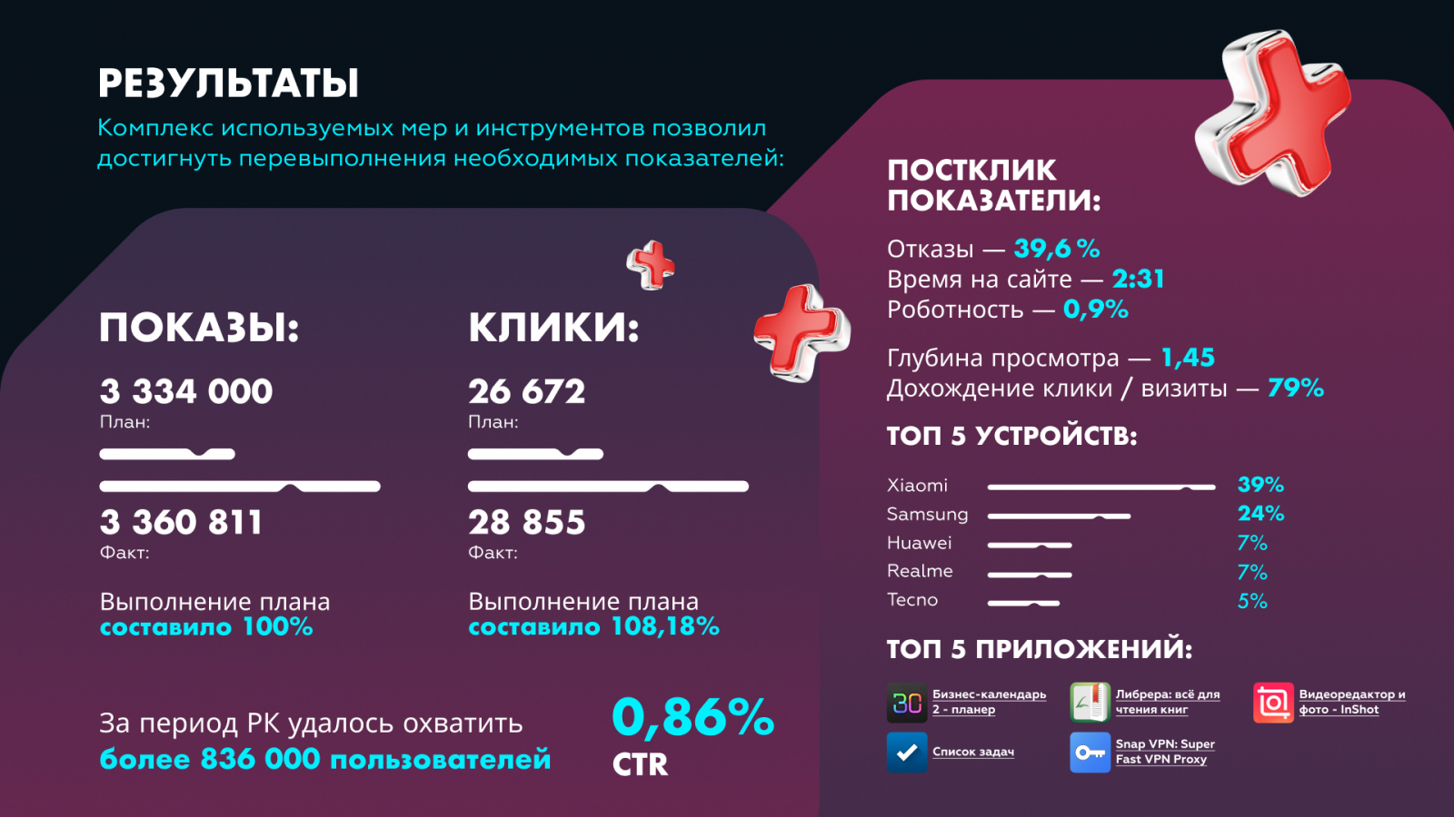 Результаты кампании: охват — более 836 000 пользователей, перевыполнение плана по кликам и показам.