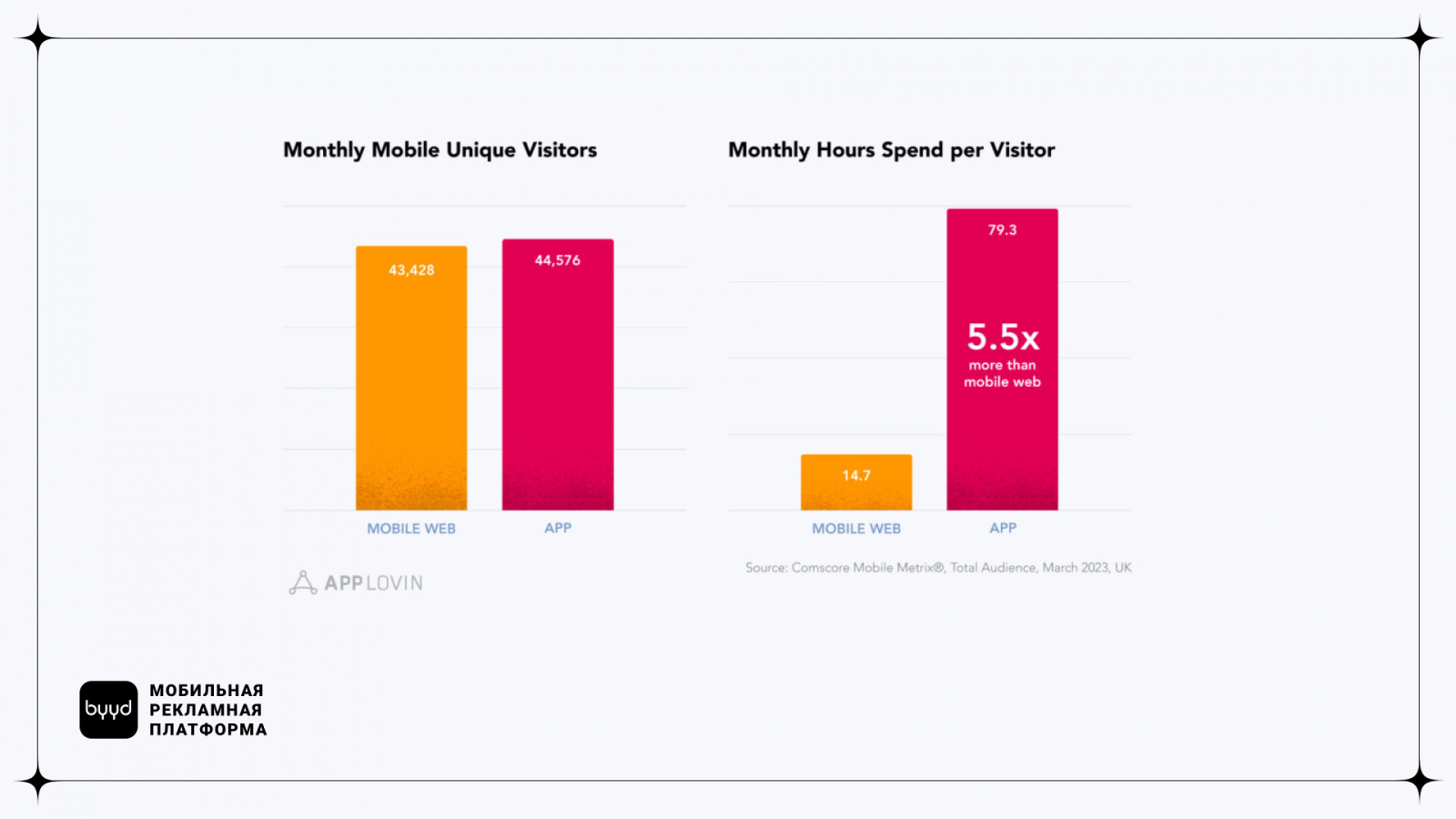 Сегодня мобильные устройства генерируют 55% мирового интернет-трафика. Более того, почти 80% этого времени пользователи проводят именно в приложениях.