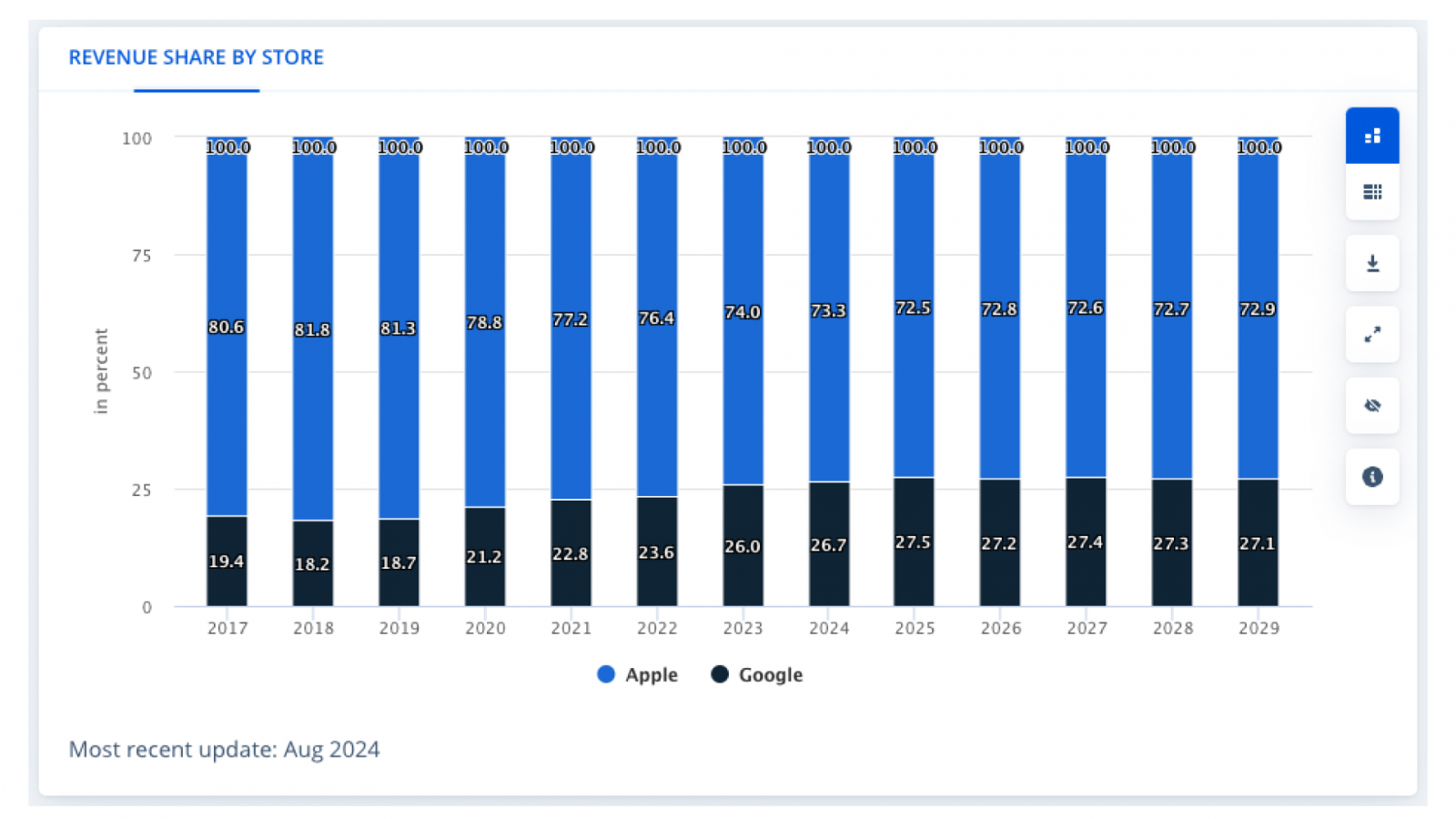 Устройства на Android тоже укрепляют свои позиции. В 2024 году они принесли 26,7% выручки, тогда как в 2018 году этот показатель составлял всего 18,2%.