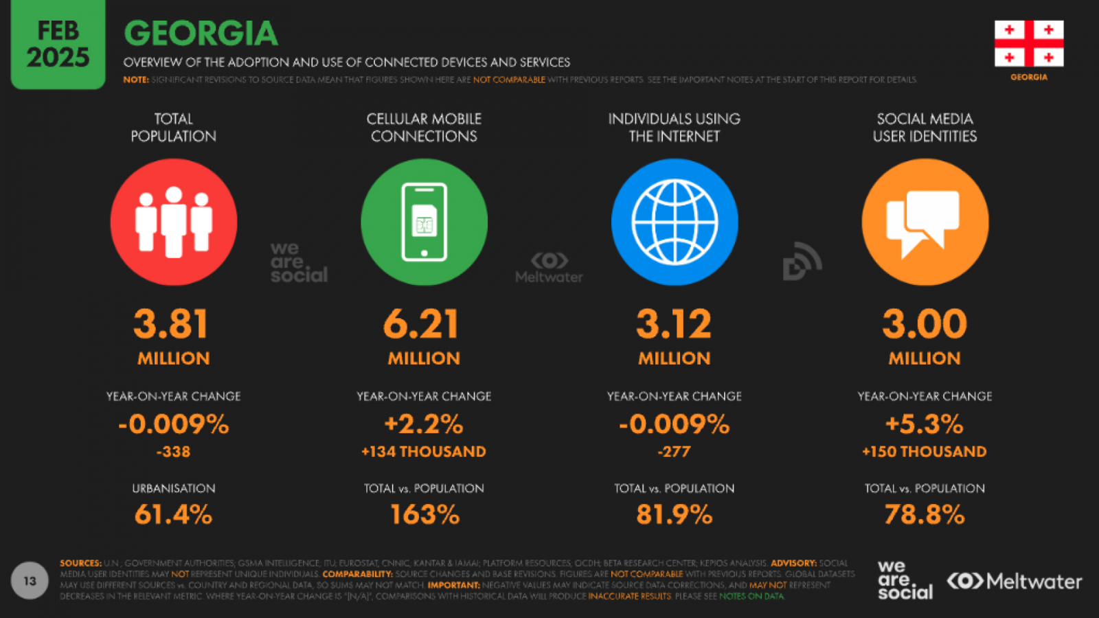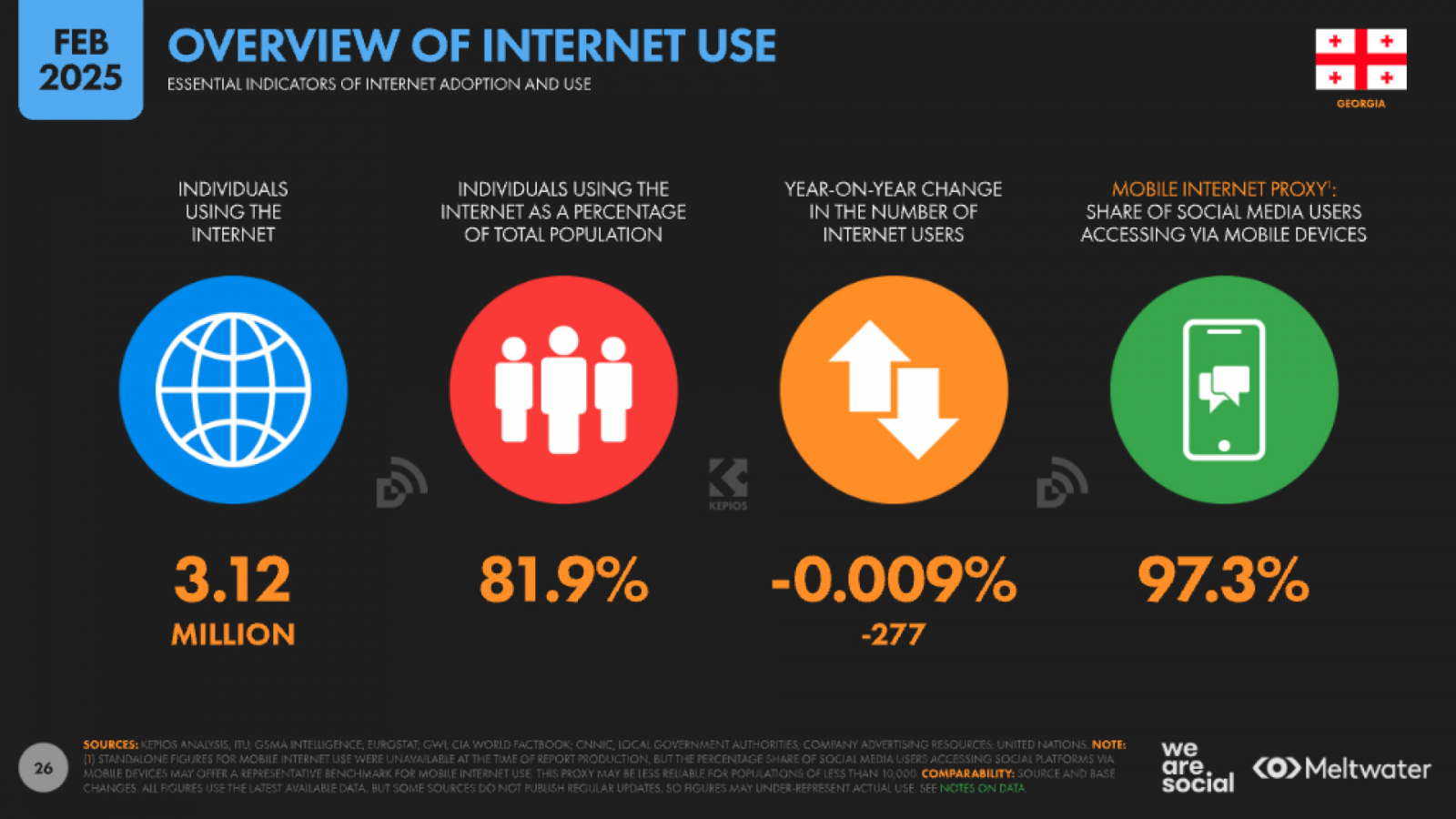 Интернетом в Грузии пользуются 81,9 % населения, что составляет примерно 3,12 млн человек. Этот показатель остался на уровне прошлого года, демонстрируя стабильность проникновения сети.