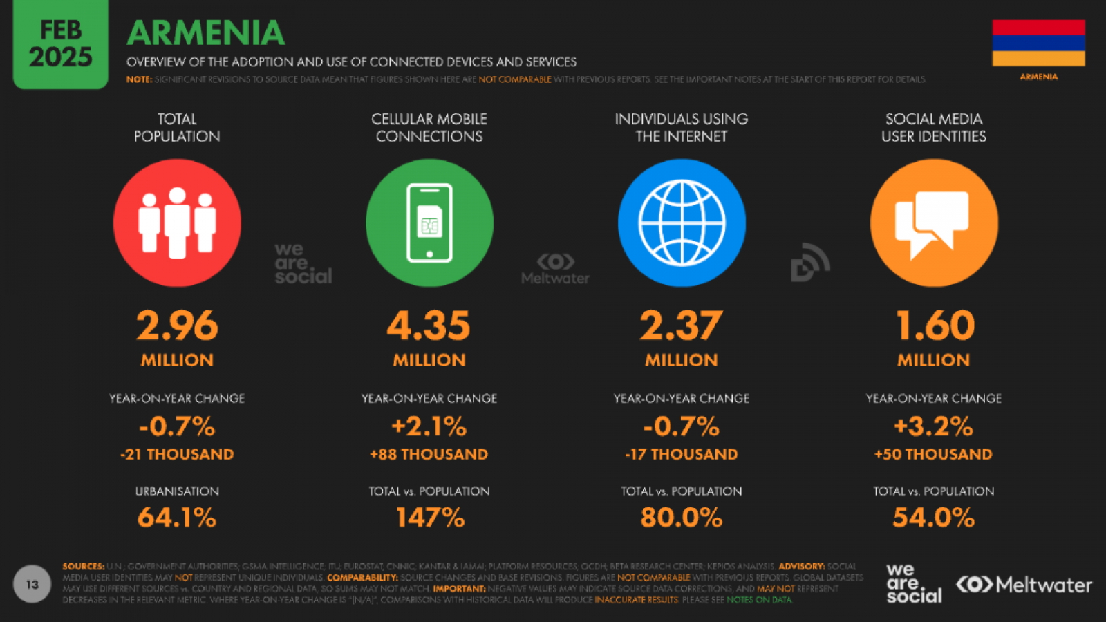 Стоит отметить, что 93,9 % жителей страны владеют телефоном любого типа. При этом Интернетом в Армении пользуются 80 % населения — это около 2,37 млн человек.