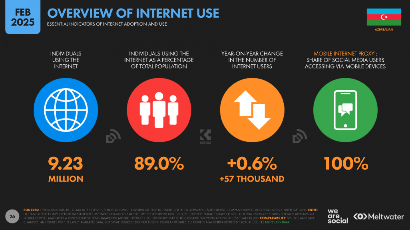 В 2025 году интернетом в Азербайджане пользуются 9,23 млн человек, что составляет 89 % населения. За год зафиксирован небольшой прирост (+0,6 %).