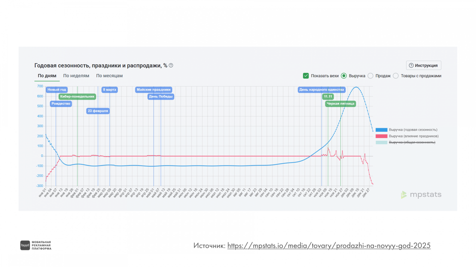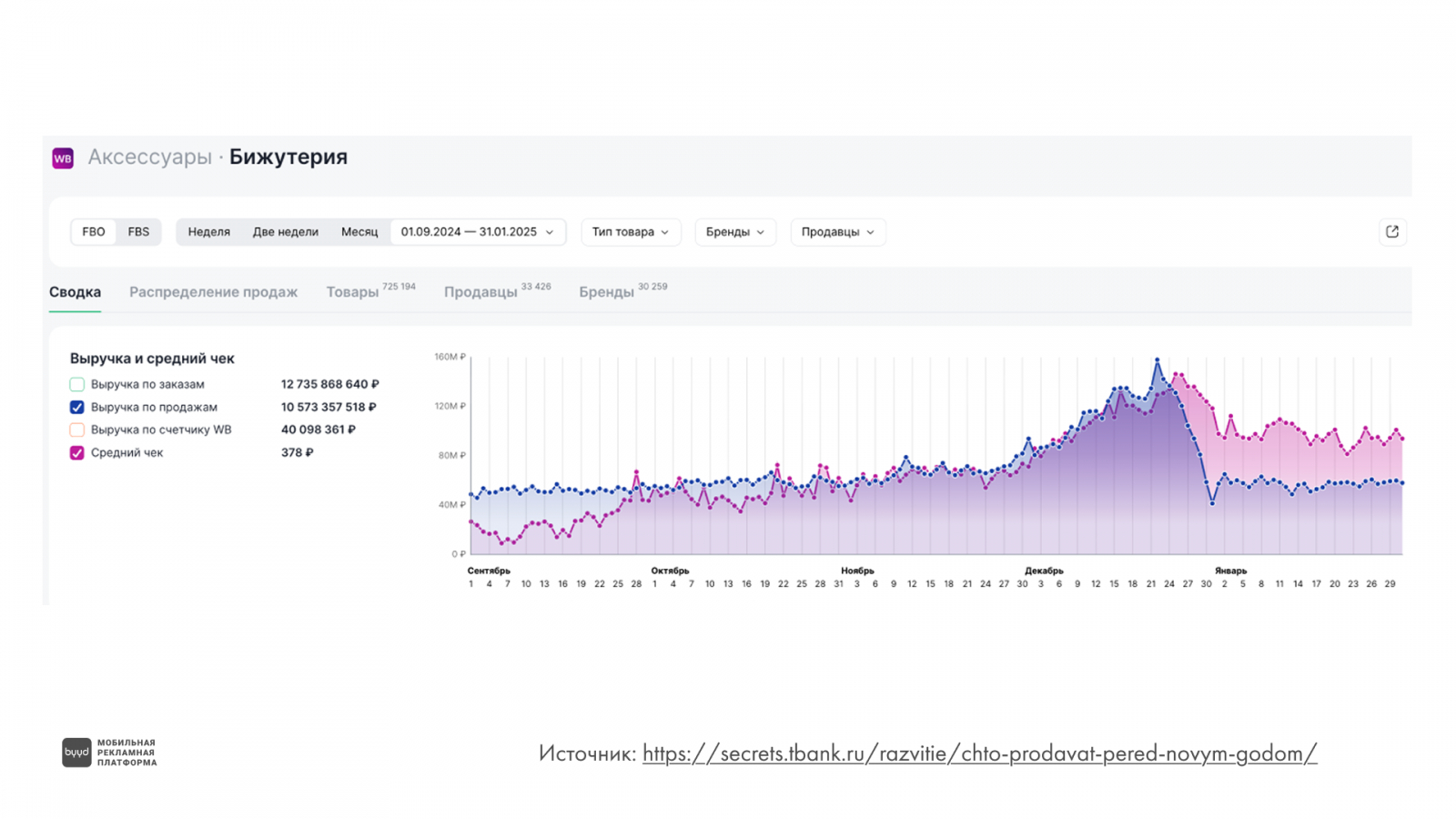 Согласно данным MPSTATS Data, большинство потребителей откладывают покупки на последний момент. Это доказывает статистика, по которой показатели декабря гораздо выше.
