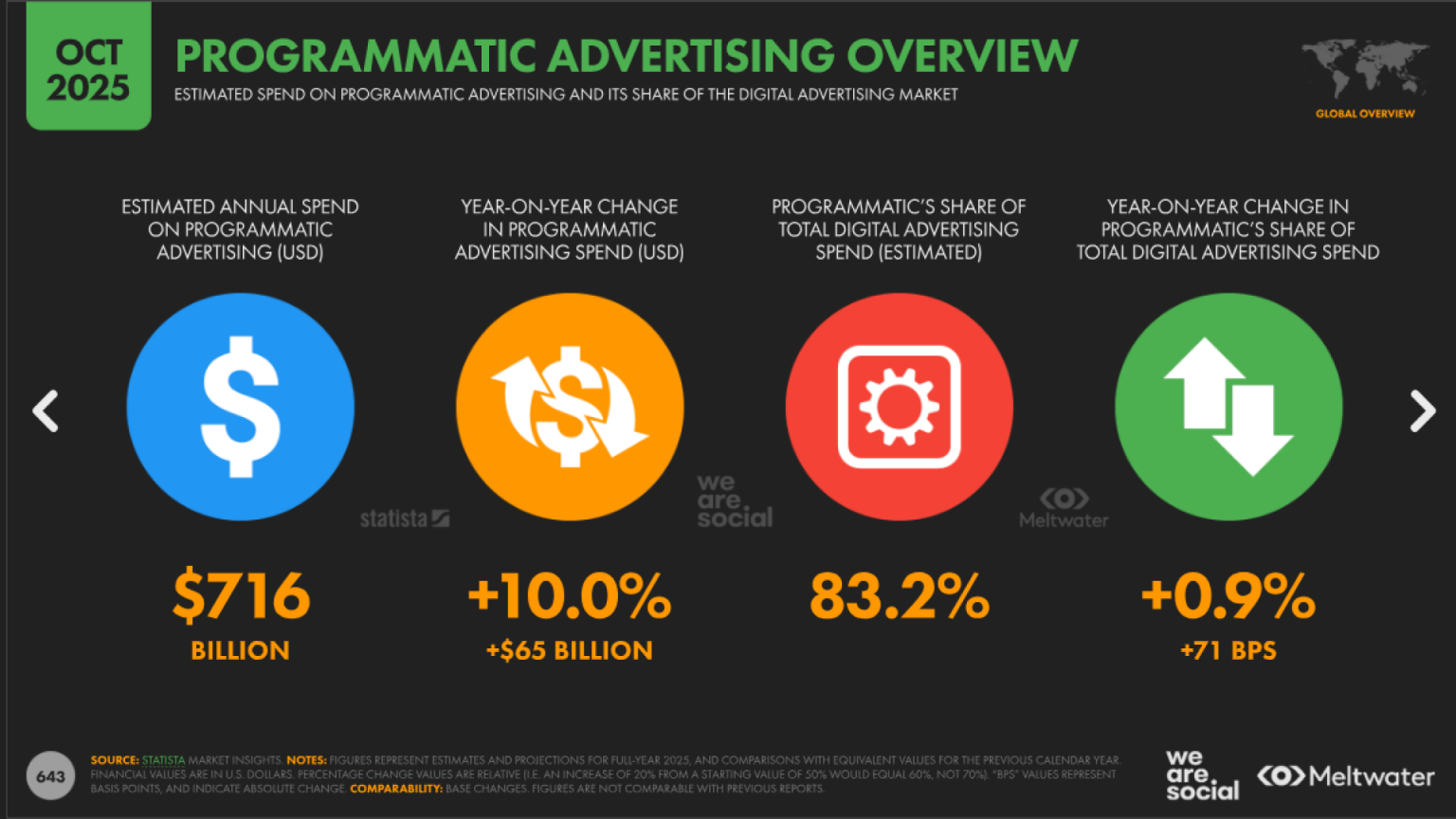 Programmatic в 2026 году становится доминирующим механизмом закупки рекламы. По данным DataReportal, в октябре 2025 года глобальные расходы на программатик достигли $716 млрд.