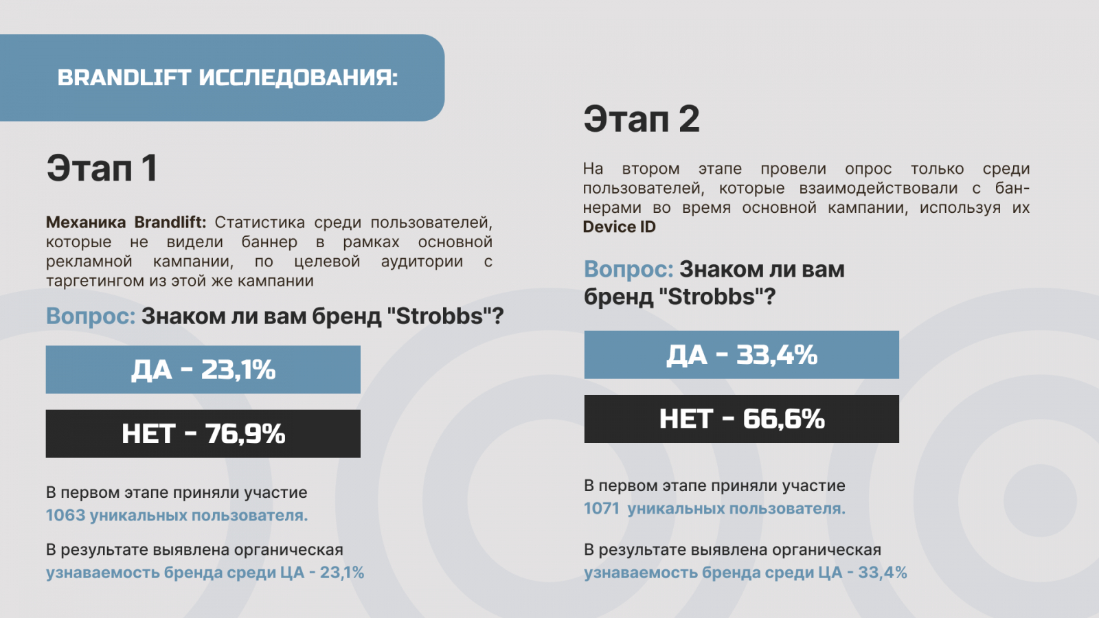 Эффективность in-app размещений подтверждается Brand Lift исследованиями в рамках кампаний. Например, рекламная in-app кампания через платформу BYYD привела к росту лояльности к бренду Strobbs на 44,4%.