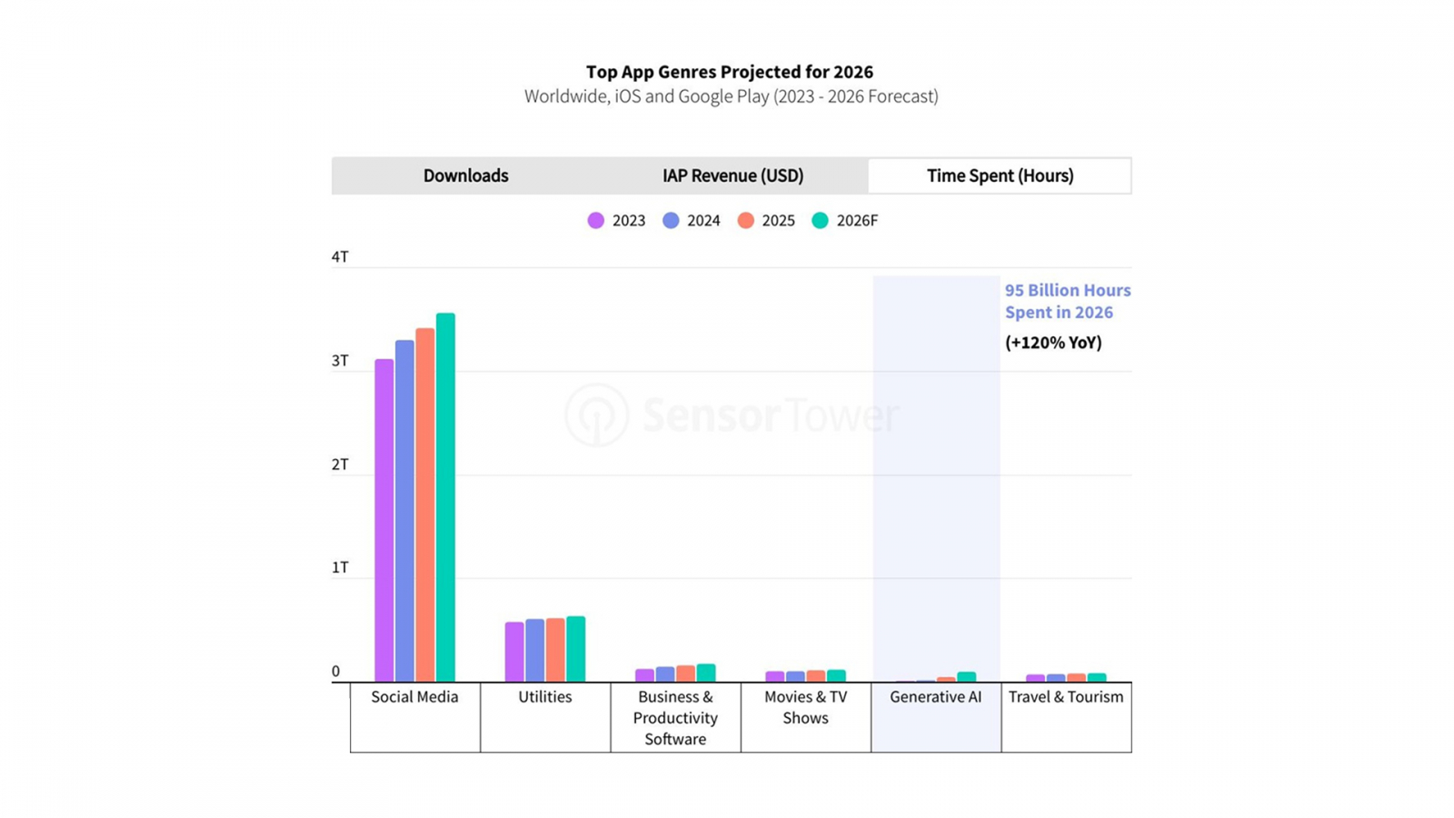 К 2026 году ожидается рост ИИ по ключевым метрикам. Во-первых, в рейтинге загрузок ИИ-приложения перейдут с 10-го места на 4-е место и опередят мультимедиа, дизайн и шопинг.