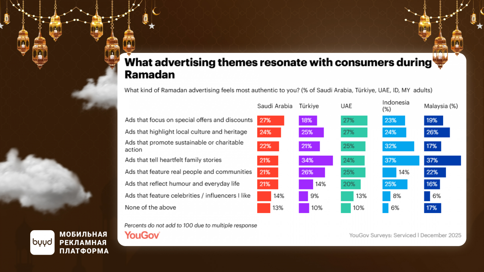 Семья и единство играют ключевую роль в том, как люди переживают Рамадан. Это особенно выражено в Индонезии (51%) и Саудовской Аравии (48%), а также в ОАЭ (38%), Малайзии (36%) и Турции (33%).