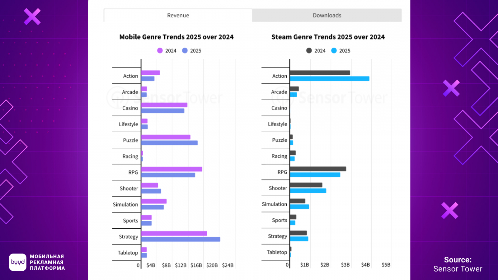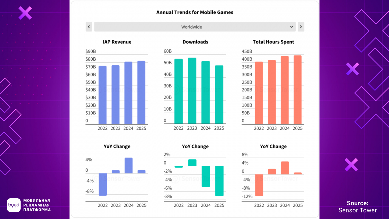 В 2025 год выручка в мобильном гейминге выросла на 1%. При этом количество загрузок и общее время, проведенное в играх, снизились. Это подчеркивает усиливающуюся конкуренцию за внимание. Соответственно, рынок теперь зависит не от привлечения новых пользователей, а от монетизации текущей базы.