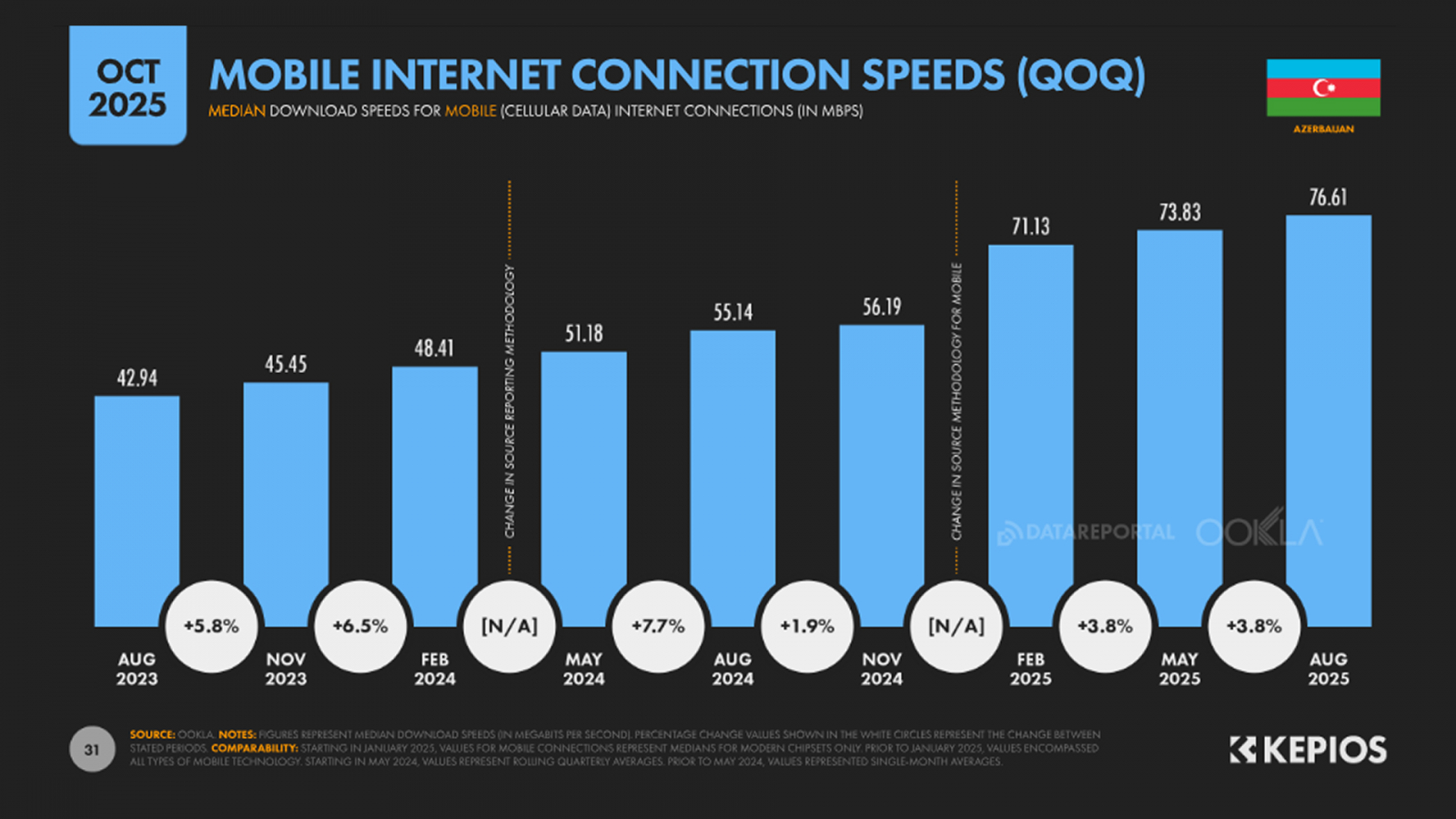 Скорость мобильного интернета стабильно увеличивается. За два года в Азербайджане она выросла почти в 1.8 раза (с ~43 до ~77 Mbps).
