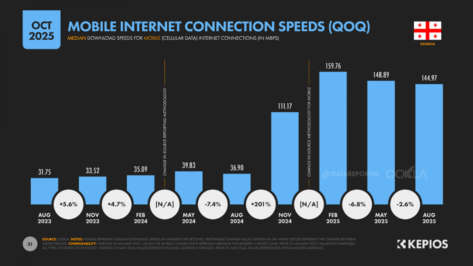 В 2025 году рост продолжился, достигнув пикового значения 159,76 Mbps. После этого скорость стабилизировалась на уровне 140–150 Mbps.