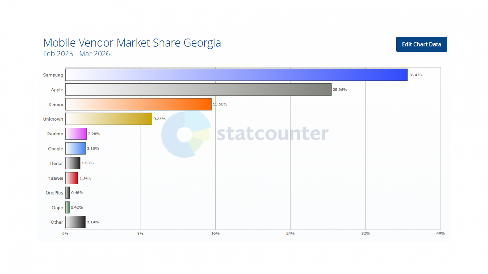 На рынке мобильных устройств Грузии ситуация отличается. Наблюдается явное доминирование двух брендов: Samsung с долей 36,47% и Apple — с 28,36%. Вместе они контролируют почти две трети рынка.
