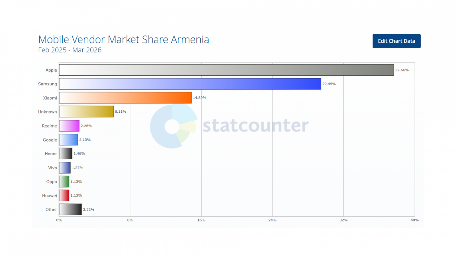 На рынке мобильных устройств Армении первое место занимает Apple с долей 37,66%. Samsung удерживает сильную вторую позицию с 29,45%.