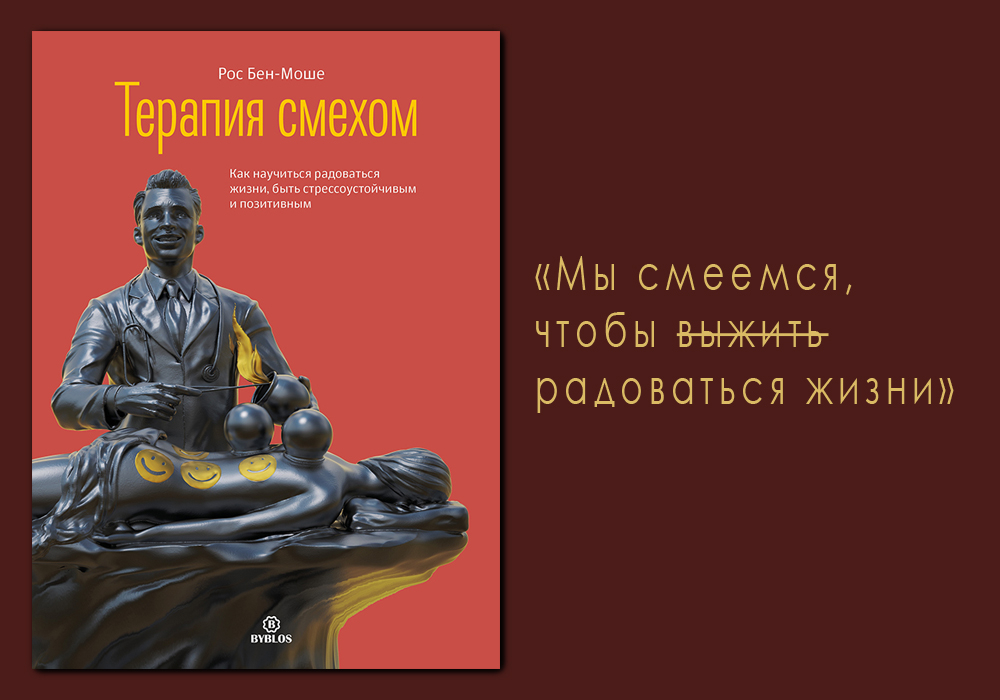 Книга йога-терапевта и коуча Рос Бен Моше «Терапия смеха» переворачивает общепринятое восприятие юмора и смеха как побочного эффекта, некоего производного и зависящего от нашего благополучия и радости бытия. Тем более, что книга написана человеком, пережившем личную трагедию тяжелой болезни – при помощи чувства юмора и благодарности тем, кто оказался рядом и помогал в трудные времена.