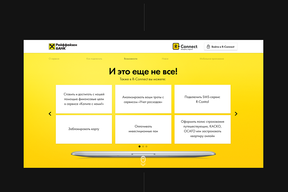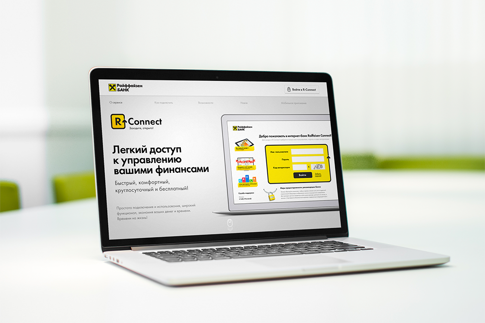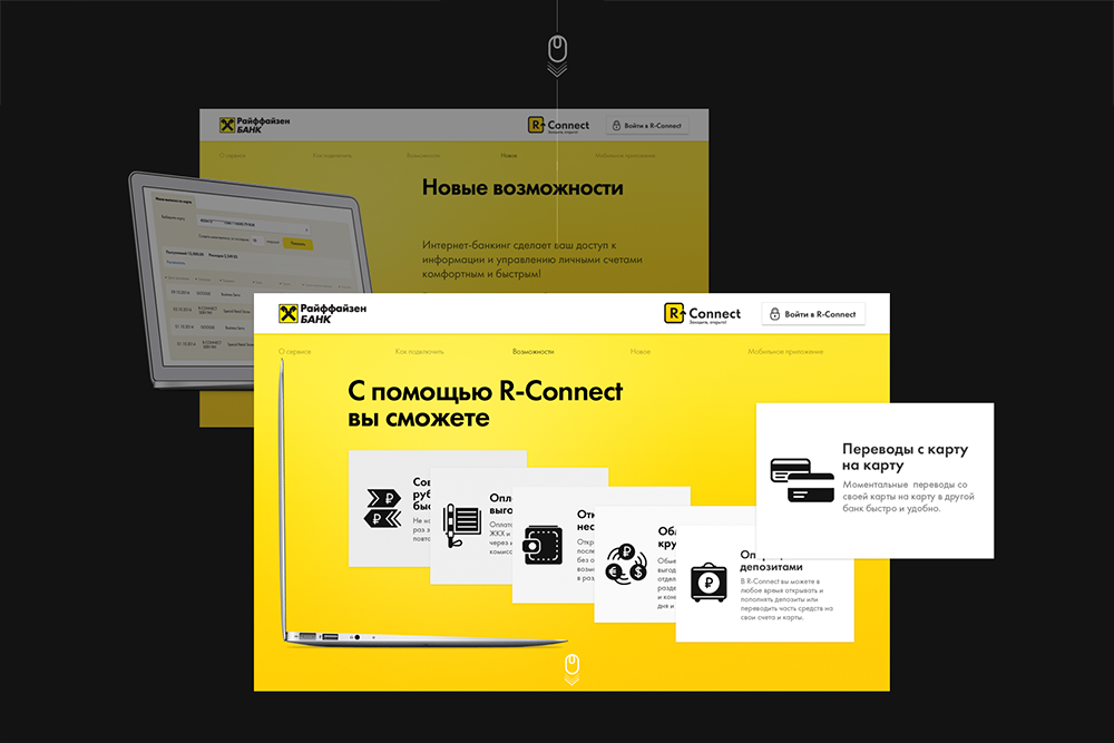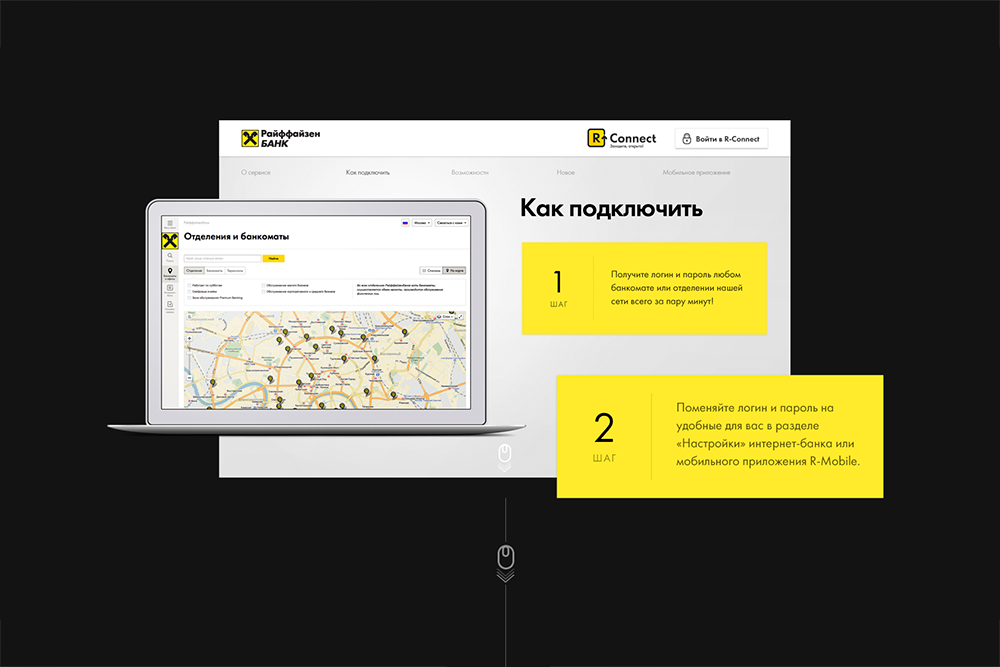 При выборе банка пользователи обращают большое внимание на возможности, которые им предоставляют его онлайн-сервисы, в том числе интернет-банк. Перед digital-бюро NewIdols стояла задача создать промо-страницу R-Connect и донести до клиентов банка информацию о легком способе управления их финансами через онлайн-сервис Райффайзенбанка.