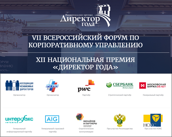 На протяжении семи лет Всероссийский форум по корпоративному управлению является главной площадкой для обмена опытом и поиска решений для развития корпоративного управления в России. Организаторами мероприятия выступают Ассоциация независимых директоров (АНД), Российский союз промышленников и предпринимателей (РСПП) и PricewaterhouseCoopers (PwC).