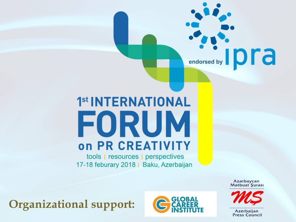 Международный форум PR Creativity проводится Центром развития Proloq (http://www.proloq.az/) совместно с Советом печати Азербайджана при поддержке Международной Ассоциации по связям с общественностью (IPRA). В форуме примут участие более 600 профессионалов коммуникационной индустрии, ученых, преподавателей и молодых специалистов со всего мира, которые соберутся для обмена творческим опытом, генерации свежих креативных идей, решения практических кейсов и нетворкинга.