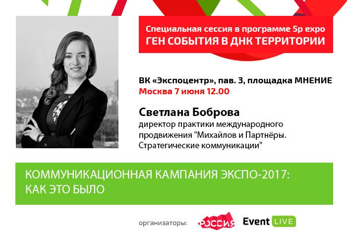 07 июня в рамках деловой программы X Юбилейного Международного форума выставочной индустрии «5pEXPO-2018» на Специальной сессии «Ген события в ДНК территории: продукт, смысл, ценность, эффективность» директор практики международного продвижения «Михайлов и Партнёры. Стратегические коммуникации» Светлана Боброва представит кейс «Коммуникационная кампания Астана ЭКСПО-2017: как это было».