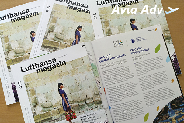 В июле 2017 г. в фирменном журнале авиакомпании Lufthansa вышла статья о крупнейшей международной выставке Экспо 2017, тема которой в этом году посвящена проблеме энергопотребления. Местом проведения выставки в 2017 году стала Астана - столица Казахстана.
