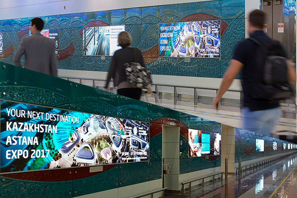 Мероприятие такого масштаба не могло обойтись без рекламной поддержки. В 2016-2017 годах Авиа Адв, подразделение рекламного холдинга М-Рус, выступило организатором рекламной кампании Expo Astana в аэропортах Франкфурта (Германия), Амстердама (Нидерланды), Дубаи (ОАЭ), Пекина (Китай) и Астаны (Казахстан). Были задействованы лайтбоксы и световые короба в залах вылета и прилёта, лаундж-зонах и терминалах.
