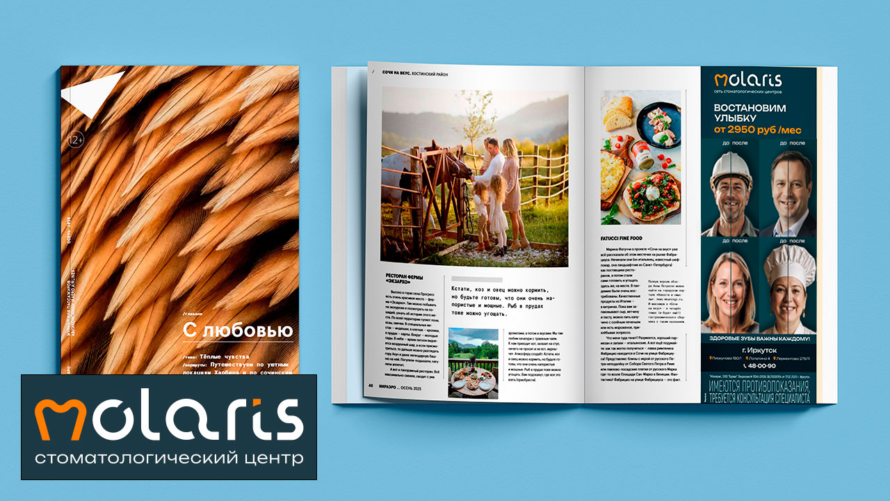 В сентябре Авиа Адв опубликовало рекламный модуль сети стоматологических клиник «Molaris» в бортовом журнале «МирАэро» авиакомпании «ИрАэро».