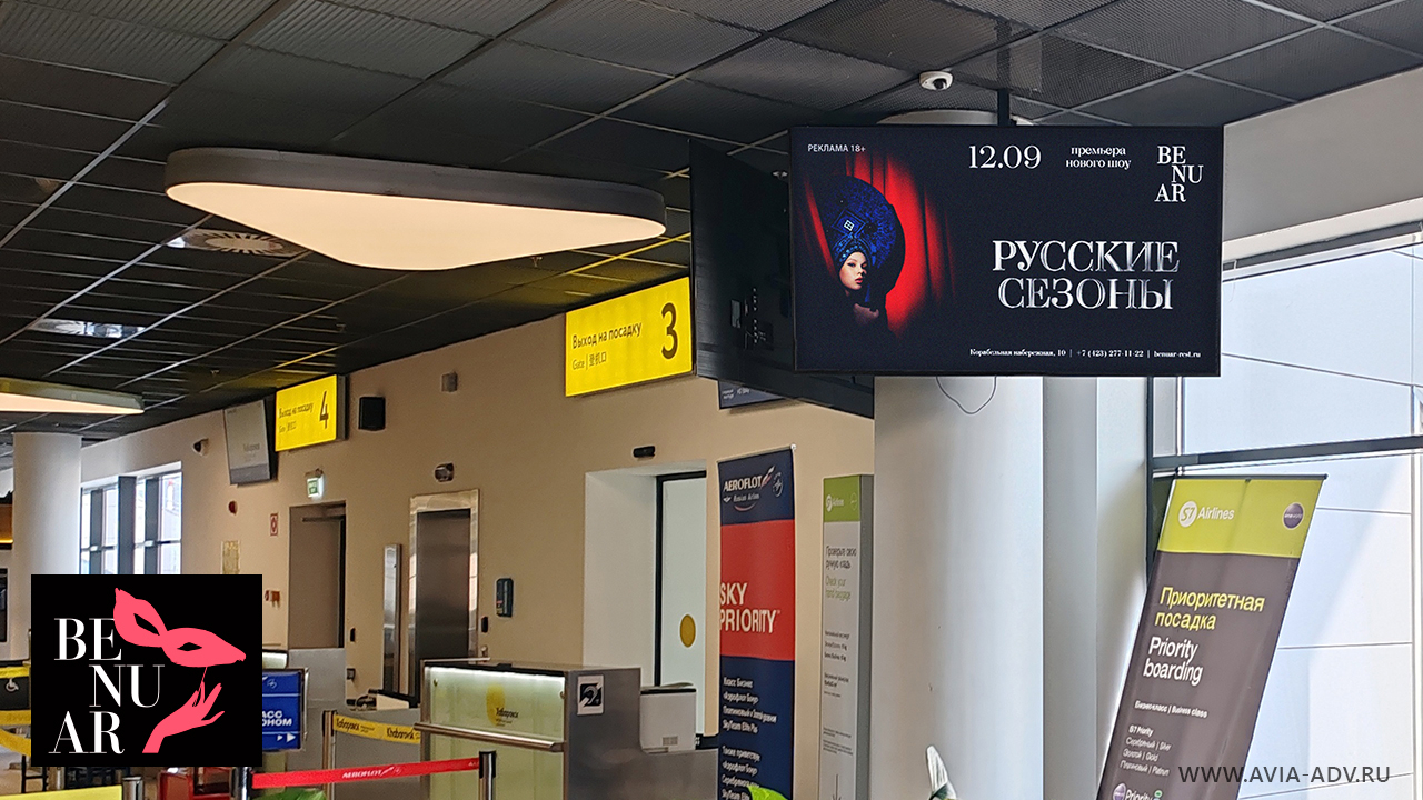 В период с августа по сентябрь 2025 г. в международном аэропорту Новый Хабаровска реализуется рекламная кампания по размещению видеороликов ресторана «BENUAR RESTAURANT» на диджитал экранах.