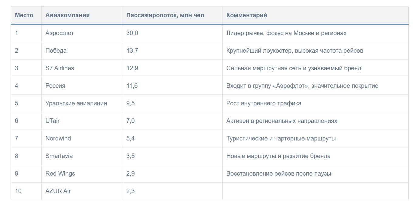 Топ-10 авиакомпаний России по пассажиропотоку (2024)