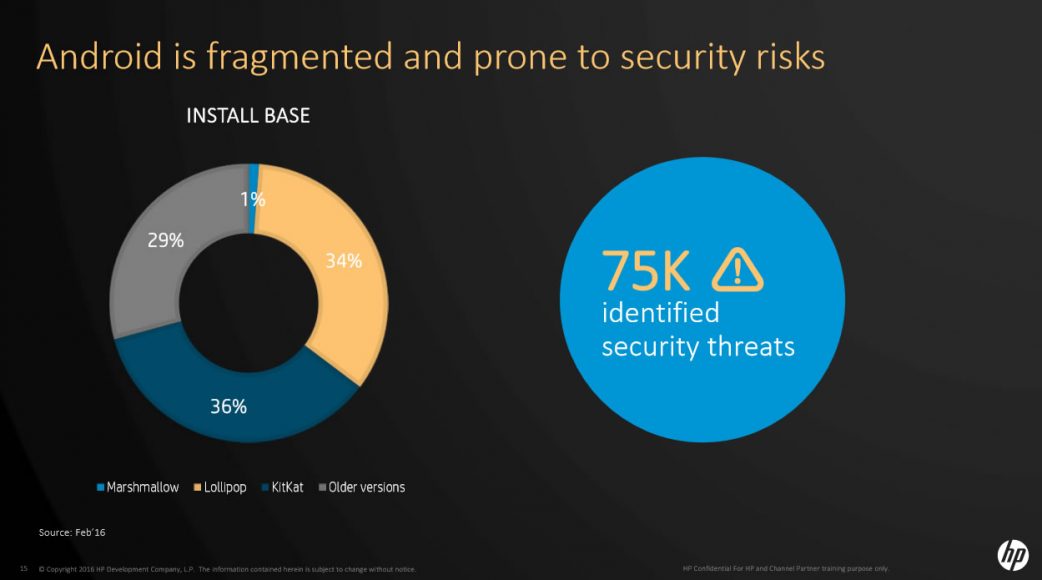 Изображения с презентации показывают, что Windows 10 Mobile намного безопаснее по сравнению с Android. К числу негативных факторов системы от Google относят фрагментацию платформы. В HP отметили как минимум о 75 тысяч известных проблем с безопасностью на Android и 36% устройств на старой версии Android KitKat. Всё это не делает Windows 10 Mobile идеальной мобильной платформой, но в HP уверены в наличии у неё некоторых достоинства, отсутствующих у конкурентов. В их числе названы универсальные приложения и интегрированные в систему возможности, над которыми Microsoft в настоящее время работает "в поте лица".В HP не видят проблемы недостатка приложений, говоря о наличии в системе всех важных компонентов и функций, включая Facebook, WhatsApp и Instagram.
