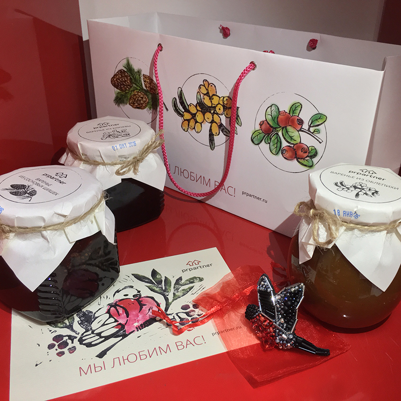 Сюрприз от генерального директора стал еще более долгожданным! Сейчас модно покупать вещицы ручной работы в Instagram. В этой соцсети удобно искать новых подрядчиков, вдохновляться идеями, видимо так случайно в одном паблике и нашлись брошки ручной работы из бисера в виде птиц. Так родилась целая легенда. Мы заказали сразу 120 брошек-снегирей, в дополнение решили дарить несколько баночек варенья: из облепихи, клюквы и сосновых шишек. Это именно те ягоды, которыми питаются зимой эти птички. К ним мы тоже подготовили особенное оформление, этикетки были нарисованы вручную и оцифрованы для тиража. Такой необычный зимний подарок запоминается!