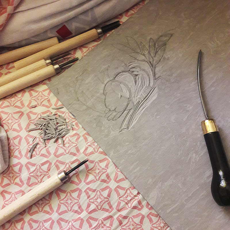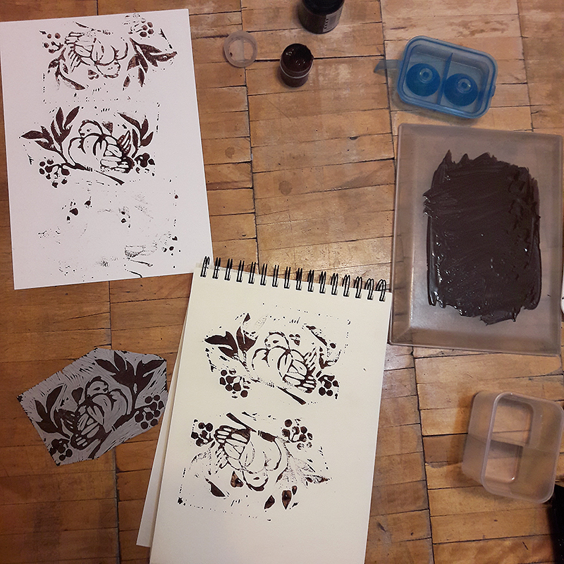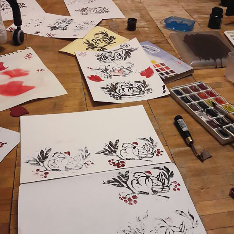 Процесс действительно трудоемкий и сложный. Сначала нужно подготовить и ошкурить специальный линолеум для гравюры, чтобы оттиск получился более четким и ярким. Заранее согласованный эскиз зеркалим и переводим на заготовку. С помощью штихеля, специального заостренного ножа для резки, были вырезаны пробельные элементы, чтобы остался только печатный контур. Тут начинается самое интересное! На специальном стекле раскатывается краска, готовится красочная форма. Заготовку из линолеума припечатывают к разноцветному стеклу, а потом переносят изображение на специальную пористую бумагу. Кстати, бумагу для оттиска подбирали тоже со всей ответственностью — всего сделали более 20 различных оттисков на 4 видах бумаги. Параллельно искали акварельные размывки, делали подборки растушевок и пятен с наиболее интересными фактурами. Лучший из полученных вариантов в результате оцифровывали и обрабатывали в графическом редакторе. Только после всех этих художественных манипуляций изображение передается в типографию, но и там отдельно подбирается бумага, качество печати, делаются пробные варианты.