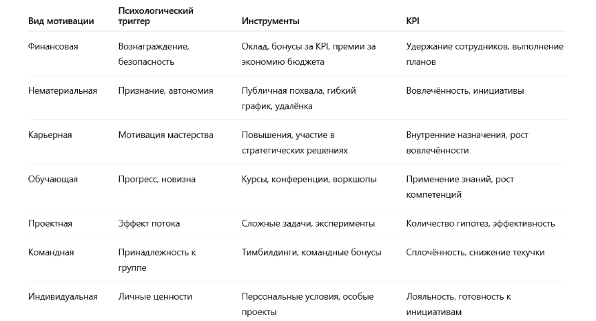 Когда руководитель учитывает, как разные виды мотивации влияют на психологию специалиста, команда работает не только эффективнее, но и стабильнее.