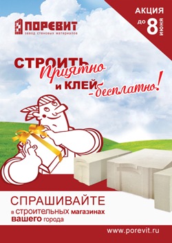 Всем покупателям блоков «Поревит», совершившим покупку до 8 июня 2010г., компания преподносит подарок: на каждые 3м3 блоков – 1 мешок клея бесплатно. Акция со слоганом: «Строить приятно и клей – бесплатно!» – представлена на различных информационных носителях (ТВ, радио, пресса, наружная реклама).