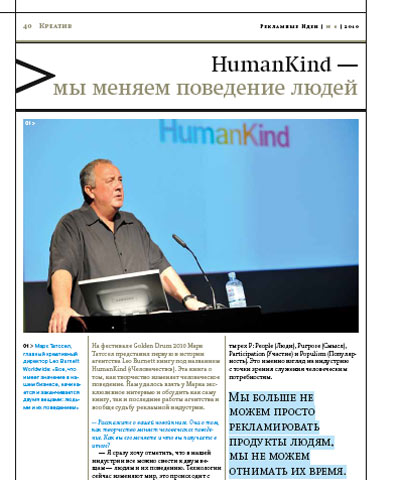 На фестивале Golden Drum 2010 Марк Татссел представил первую в истории агентства Leo Burnett книгу под названием HumanKind («Человечество»). Эта книга о том, как творчество изменяет человеческое поведение. Нам удалось взять у Марка эксклюзивное интервью и обсудить как саму книгу, так и последние работы агентства и вообще судьбу рекламной индустрии.