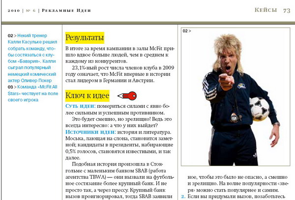 Победитель Euro Effie. Смелый вызов маленького игрока большому, слабого сильному - это история, которая всегда привлекает внимание людей. Давид победил Голиафа, Кот в сапогах победил Людоеда, Вьетнам устоял перед США. А вот сеть фитнес-центров McFit бросила вызов знаменитому футбольному клубу. Кампания сопровождается блоком Ключ к Идее.