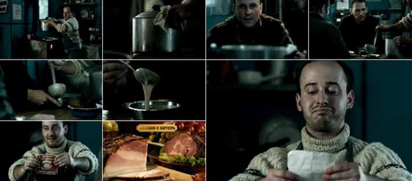 Север. Холодно. Рабочие возвращаются со смены, заходят в бытовку, садятся за стол. Повар ставит перед ними кастрюлю невнятной, отвратительной бурды и в то время, как уставшие мужчины едят обед, читает им текст с этикетки мясного деликатеса. Все рады и счастливы... Реклама. А как все обстоит на самом деле?