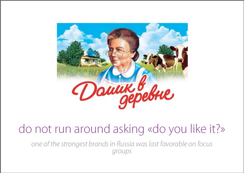 В финале своего выступления Андрей вывел на экран картинку с упаковки «Домика в деревне»: «Не спрашивайте потребителя “Нравится ли вам?” Этот бренд, сегодня один из самых сильных в России, был последним во время оценки на фокус-группах. А теперь он стоит 300 миллионов по оценке Interbrand».
