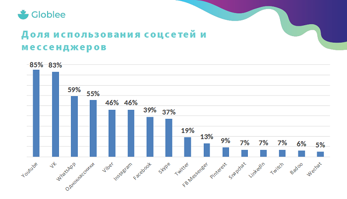 Аналитики коммуникационной платформы Globlee собрали данные по проникновению социальных сетей в России за первое полугодие 2019 года.