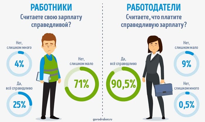 Мнения российских работников и работодателей разошлись: 71% работников назвали свою зарплату слишком низкой, а 90,5% работодателей считают зарплаты сотрудников достаточными.
