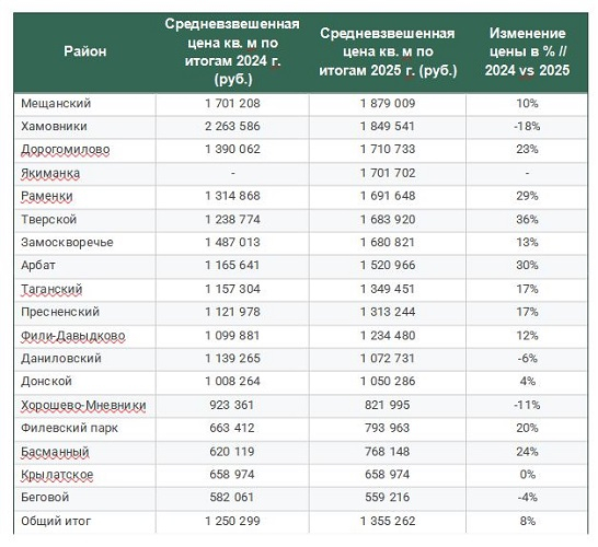 Согласно данным совместного исследования аналитиков Kalinka Ecosystem и «Хайтэк Девелопмент», по итогам 2025 г. средняя цена квадратного метра жилья в самых дорогих районах Москвы выросла на 8% по сравнению с 2024 г. с 1,25 млн до 1,35 млн руб. При этом одни локации показали двузначную положительную динамику, другие — неожиданное падение.